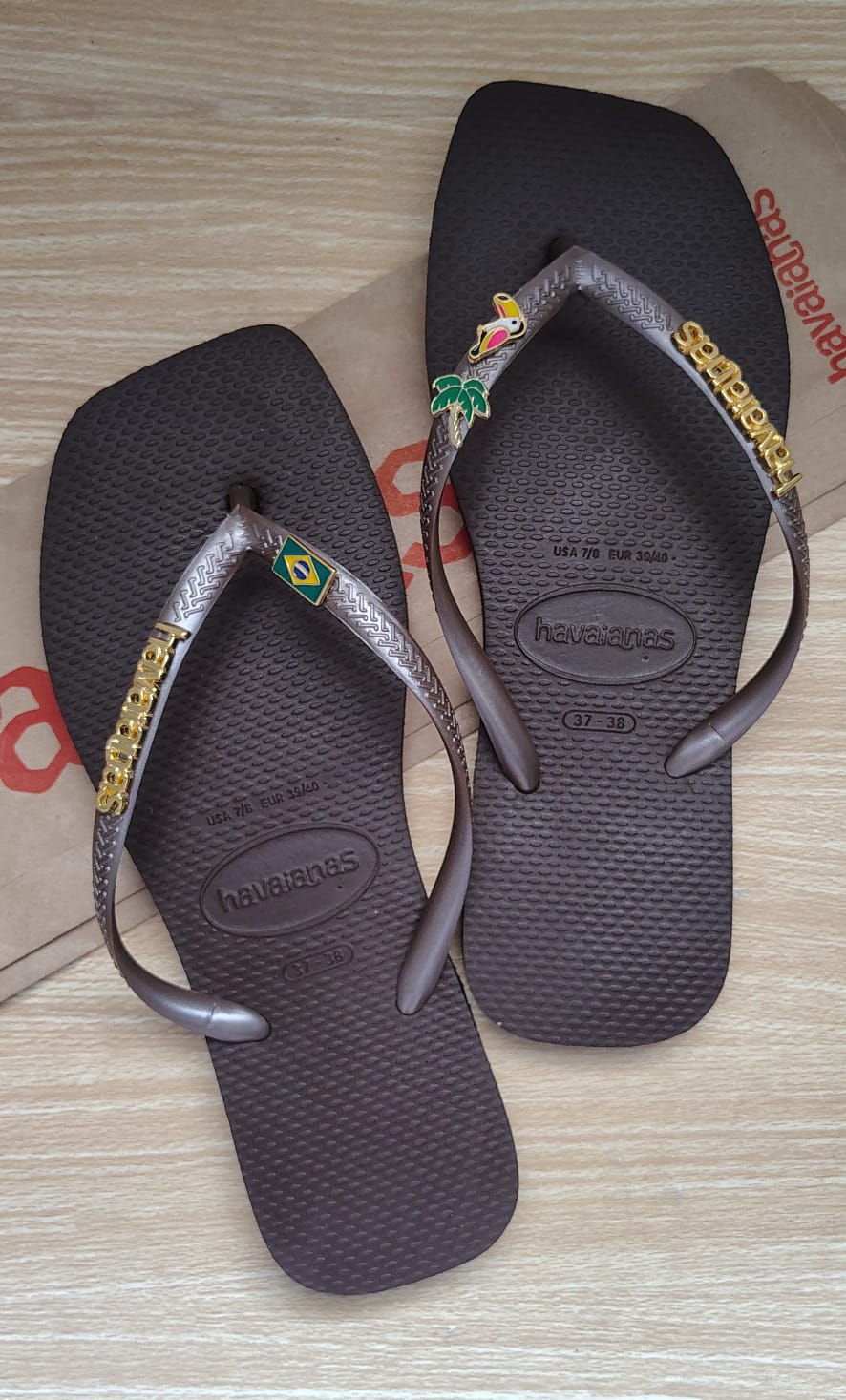 Havaianas Quadrada Personalizada com Pingentes Bandeira Brasil Tucano e Coqueiro