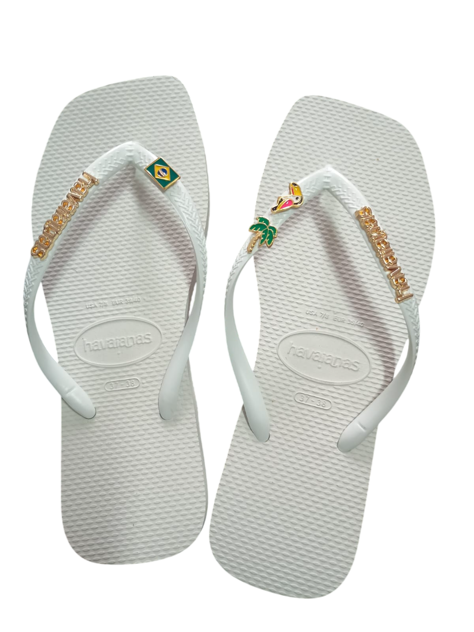 Transforme seu visual com esta Havaianas Quadrada personalizada, disponível nas cores branca ou café. Os pingentes exclusivos — bandeira brasileira, tucano e coqueiro — trazem a magia do Brasil para seus pés com estilo e autenticidade. Cada elemento foi escolhido para celebrar a identidade cultural e a beleza natural do país. Confortável para o dia a dia e marcante o suficiente para destacar seu look em qualquer ocasião, esta peça combina a qualidade durável das Havaianas com um toque de personalização que a torna única. Uma escolha perfeita para quem deseja expressar sua conexão com o Brasil através de um acessório que fala por si só.