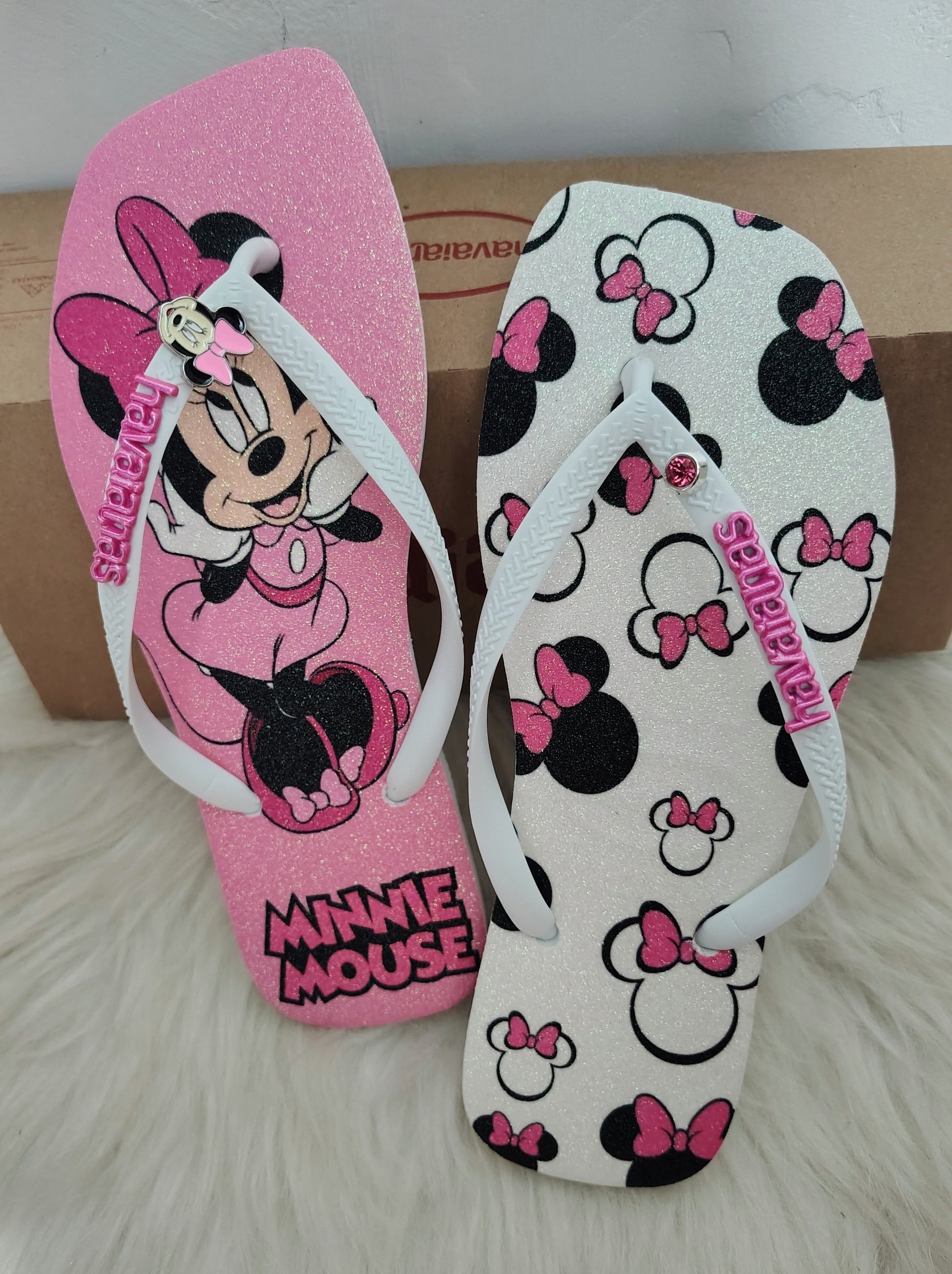 Apresentamos o modelo Square com solado personalizado ( Você pode incluir nome se preferir). As correias com logomarca Havaianas em rosa metalizado e pingentes da Minnie e ponto de Luz. Um charme de tirar o fôlego.